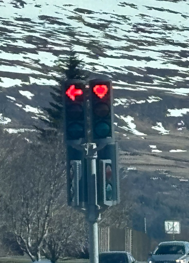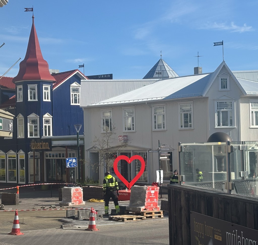We stayed just one night a bit north of town to give us a head start on a longer travel day (3.5 hours) to Akureyri (AH-kuh-RAY-ree), the unofficial capital of North Ireland. On the way we drove over a pass that had higher snow poles than most places of the Ring Road (pictured below, which also shows what the 2-lane paved roadway looks like) and discovered several jagged peaks. Akureyri is right along the deep fjord called Eyjafjordur where fishing is the mainstay. I found this town of 18,000 people to be very light-hearted. Not only was there a wonderful red heart sculpture right across from our Kea Hotel, but the red in all its stoplights was in the form of a heart! Even the vacuum cleaner used by housekeeping also reflected the town’s joy!