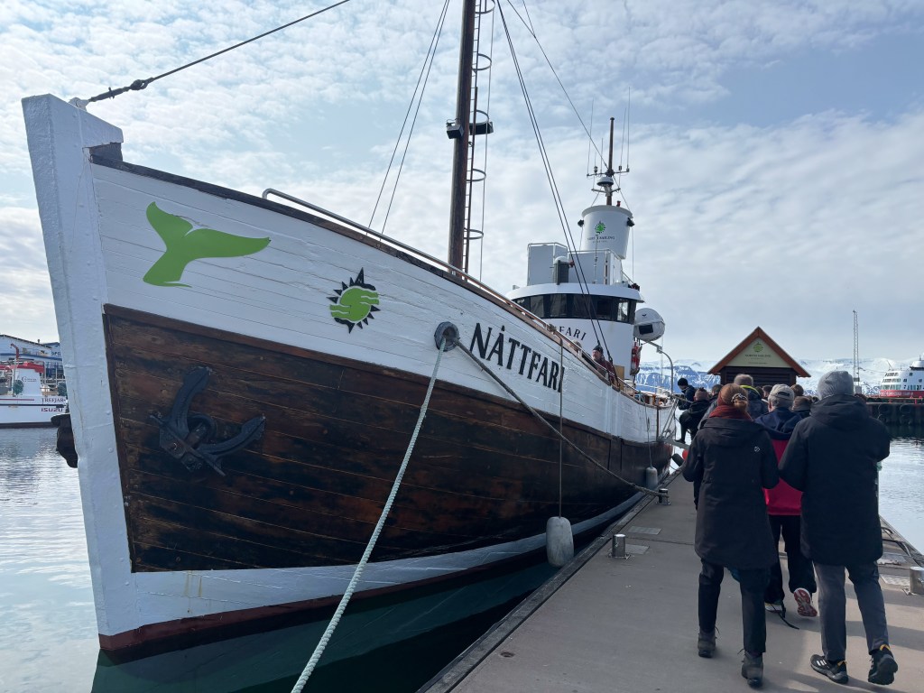 We stayed 2 nights in Akureyri (again, part of our pacing). As we headed northeast the next day, the road took us through the 7.5 kilometer (4.6 mile) Vadlaheidi Tunnel—the only one with a toll, and we had to pay online within 24 hours either before or after traveling through it. Our destination was “The Whale Watching Capital of Iceland,” Husavik (HOOS-ah-VEEK) where we went on a 3-hour whale watching adventure (complete with wind- and waterproof overalls!) in the Skjalfandi Bay, a part of the Greenland Sea, just 35 miles away from the Arctic Circle!! This is the farthest north we’ve ever been. Fortunately, it was a bright and sunny day, but coming back across the Bay late afternoon, it was quite chilly and both of us got drenched from the bow spray. It was definitely worth it though, because the scenery was amazing and we saw several humpback whales, some quite close to our boat—a big, sturdy old wooden boat—and a wonderful North Sailing crew who were marine biologists so we learned a lot about these remarkable mammals.