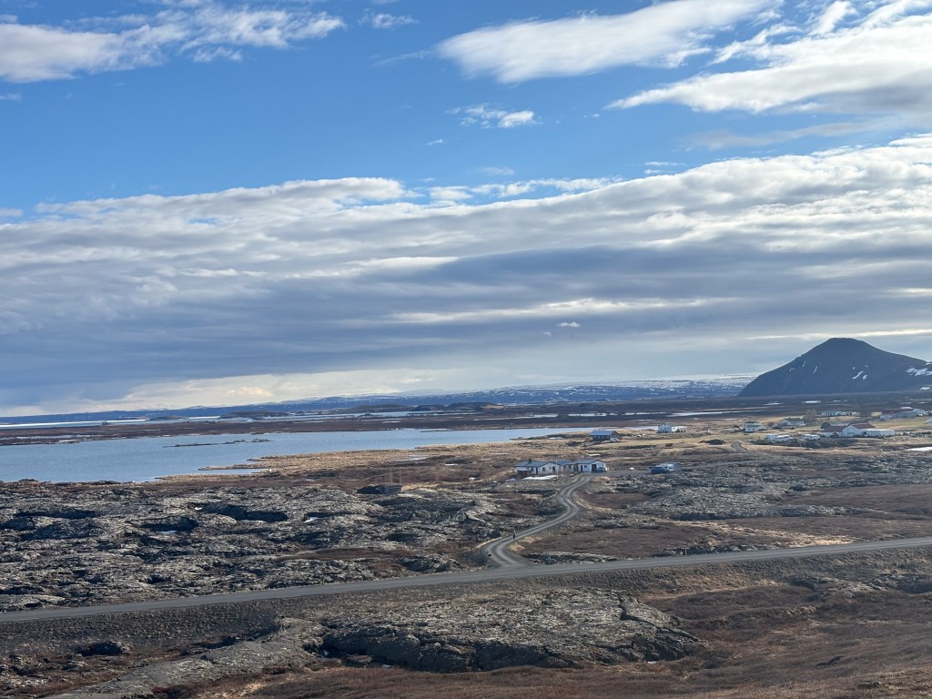 After whale watching, we had an easy drive to our next stop, Myvatn (MEE-vatn, n almost silent). Our wonderful Foss Hotel overlooked the volcanic Lake Myvatn. I took two pictures from the balcony in our room to show the panorama and sent them to my daughters (views from our room have become a part of our reporting to them as we go along), and Carolyn wrote back: “Kinda makes you miss a good tree.” Only then did we realize it had been several days since we’d seen any trees, and it was another 75 miles east of here before we finally came across a few small forests. After Carolyn’s text message, Gary and I laughed every time we looked out the windows of our hotel. We could see for miles in every direction, and, in the vastness, there were NO TREES!