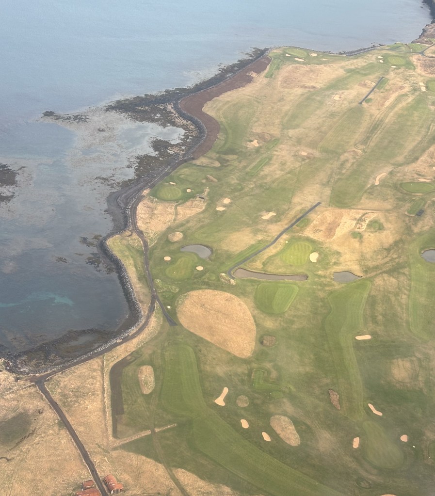 We also learned that the relatively new Eldfell (Eld-fehtl) volcano emerged on this island during a series of volcanic eruptions in 1973, expanding the island’s footprint by one third. Residents were evacuated and a third of the town was destroyed. We saw some of the half-buried homes and walked across some of the lava ash and rock on newly-formed hills and valleys. Fortunately the harbor was undamaged and, in fact, the eruptions narrowed the harbor’s mouth enough to make it a more sheltered anchorage. During our tour, we also came across an amazing golf course—yes golf! We were reminded that one of the first photos we took from the air approaching Keflavik Airport two weeks before was that of a golf course (below left). Gary couldn’t believe it, but during one of our tours we found out that golf is the fastest growing sport in Iceland and there are 67 golf courses! Who knew! There’s a sign on this island proclaiming their golf course to be the “Best Golf Course in Iceland.” The setting was quite beautiful and some of the holes looked quite challenging.