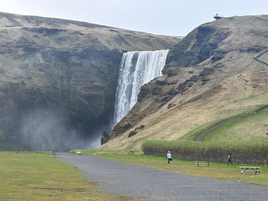 Not too soon afterwards, the storm let up a bit and the remaining 30 minutes of drive time was much easier, at last! This is the only day that I didn’t help with the driving …Gary has far more experience driving in bad weather, especially snow, and I’m so very grateful he had not only upgraded our rental car to a bigger, heavier 4-wheel drive (a Mazda CX90), but especially grateful that he was able to get us through this day safely. We were exceptionally relieved and glad to finally get to our next stop where we would stay for 2 nights at the Hotel Skogafoss right next to the stunning Skogafoss Waterfall (82’ wide and 197 feet high). Quite the day!