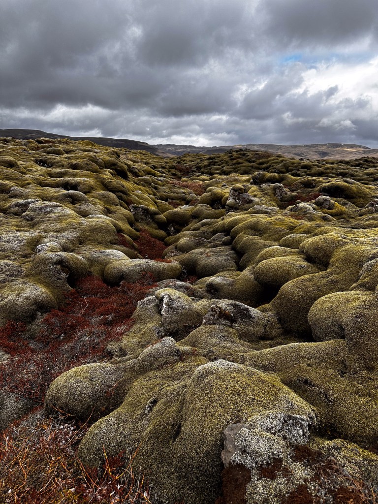 I figured as long as I was out of the car, I would just deal with the chilling wind and walk the 6-8’ over the lava to stick my fingers in the moss. AND, I had to fight to keep my footing. I pursued midst shrieks of dismay, finally got to the moss that was much deeper than my longest finger would reach—pretty amazing when we consider it takes nearly 70 years for each inch of moss to grow. (That’s why we were told never to walk on the moss!) As I turned around to get back into the car, I was really struggling against the wind and continuing to shriek. Gary took a video thinking I was expressing great awe and joy at what I’d experienced. Only when I managed to get back in the car, grunted trying to get the car door closed and started shaking did Gary realize it had NOT been a very joyous experience! Whoosh! It was brutal!!! Here’s what the moss on lava looks like normally (left)….it was very strange on this day to see snow covering the moss!