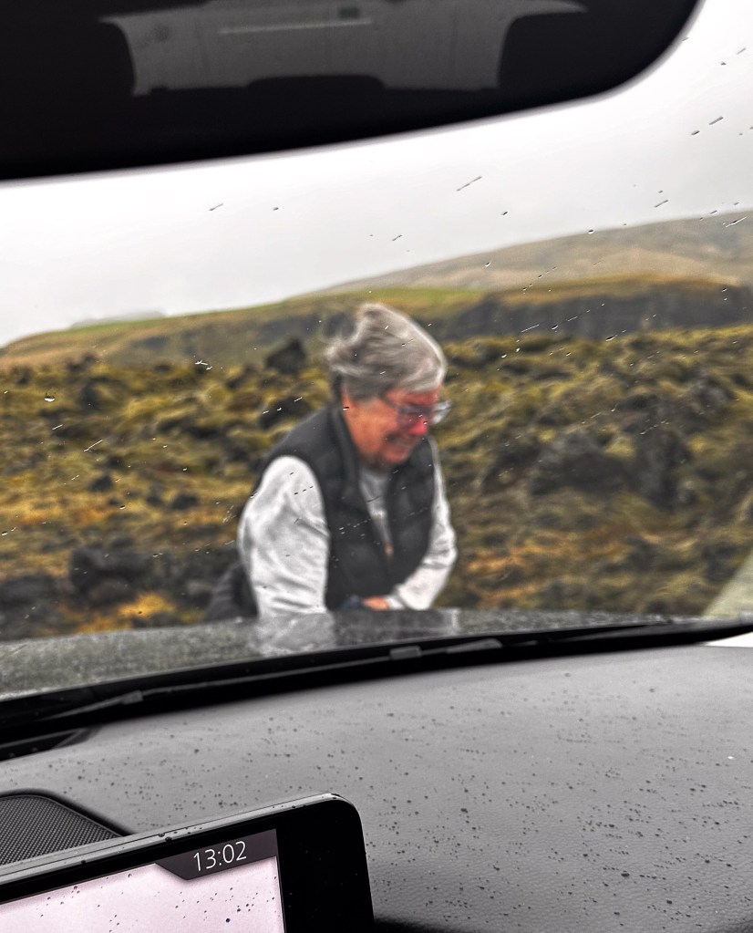 The whole time we were in Iceland, the temperature never got above 50 degrees. AND, if it was sunny and there was no wind, we were quite comfortable in a long-sleeved shirt, adding a vest if the wind came up a bit. AND, when it was raining or snowing (the day we traveled from our Geroi Guesthouse, through Vik to our next stop at Hotel Skogafoss), we got a taste of what winters might be like in this land of vastness and ice. At one point, the wind was blowing so hard midst the rain, sleet and snow, that while Gary was getting fuel, it blew his glasses right off his face! We did not realize how bad it was until shortly before that when Gary pulled off the road because he wanted me to experience first-hand what the moss felt like that we saw so many places throughout the southern and western parts of the country—mosses covered much of the lava rocks and hillsides. It was just a little “misty” at the time and he said, “No need to put on your coat,” so I opened the car door and the door blew out of my hands! (The rental car agency had warned us that winds sometimes were so strong that car doors could be blown off their hinges. Now I see why!) Wow!