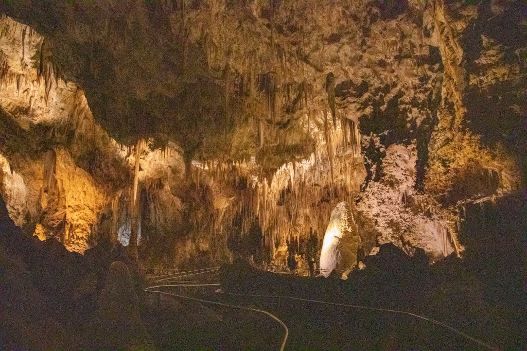 What we saw were a variety of stalagmites (up) and stalactites (down)—(I think of a mighty thumbs up to remember which is which)—together with formations called soda straws, draperies, flowstone, columns, lily pads, cave pearls, popcorn, etc., some quite small and some HUGE!!! It’s hard to briefly describe how all of this was formed, but basically it all began slowly over 500,000 years ago, after the cavern had formed—at a time when a wetter, cooler climate prevailed. Creation of each formation goes through a rather complicated chemical process that results in drops of calcite-laden water “depositing its tiny mineral load as a crystal of calcite. Billions and Billions of drops later, thousands of cave formations had taken shape.” The popcorn was formed differently, where water evaporated and left behind aragonite—similar to calcite but with a different crystal structure. All of it was absolutely jaw-dropping amazing!