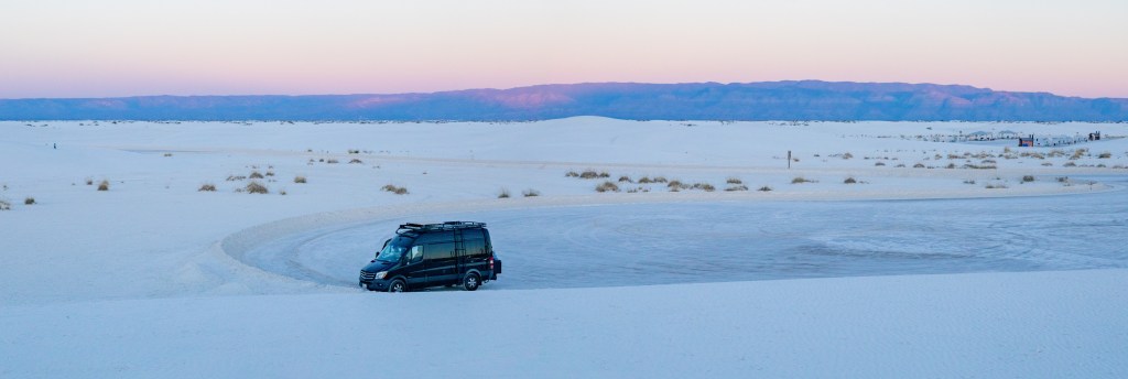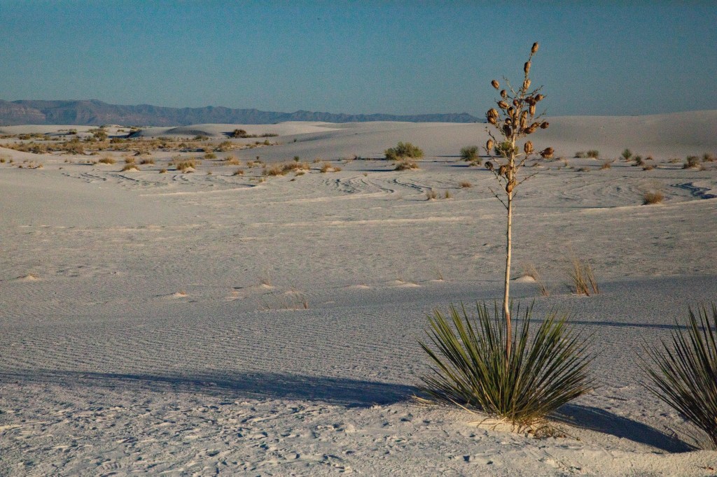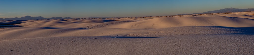 When we descended, we were treated to the vastness of the New Mexican plains and our first peek at White Sands (above right). With the little we’ve seen so far on this trip, we’re beginning to see why New Mexico is called “The Land of Enchantment.” And once again, we found a welcoming KOA Campground in nearby Alamogordo (where most businesses are) to spend 2 nights. Photographer Gary got very excited when he discovered there were so many photo possibilities at White Sands National Park at sunset, so we took off fairly soon the same day to see what we could find—about a 30-minute drive. We were surprised at how wet the sand was (and how hard it is to climb, since it’s very loose). We also discovered that White Sands is the largest gypsum dune field in the world, shelters over 800 species of animals and is described as one of the world’s great natural wonders. It was especially fun to watch some families sledding down the dunes (we passed on this) and also to photograph our very long shadows (love those long, skinny legs!). Here are some of the photos we took: