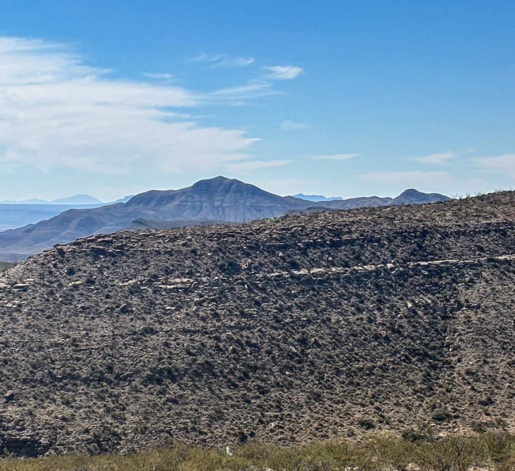 We’ve done quite a bit of “recalculating” for various reasons during this trip, and we’re still finding ourselves changing plans some. Our next 2 stops after Big Bend were Guadalupe Mountains National Park and Carlsbad Caverns. Because they are an easy drive from the city of Carlsbad, NM, we ended up with a welcome 4-night stay at another very nice KOA Campground there. The Caverns are in New Mexico, but are part of the Guadalupe Mountain range set on the Texas/New Mexico state line. The Visitor Center for Guadalupe is actually back in Texas, so that’s where we went our first day. This Park is a land of tall peaks and arid Chihuahuan Desert landscapes, with limited access by car (and a haven for serious hikers). It’s best known for its 8749’ Guadalupe Peak, the highest point in Texas (below, left, harder to photo from the road). Much closer to the road is the massive cliff face called El Capitan that has guided Native Americans, western explorers and settlers for centuries.